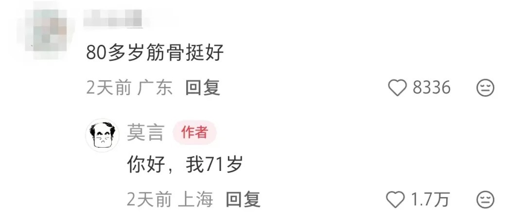 有网友表示,“80多岁筋骨好。”莫言立马辟谣:“你好,我71岁。”
