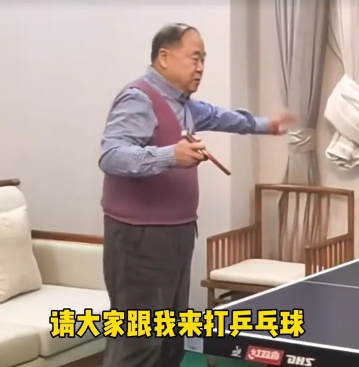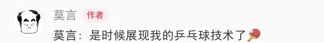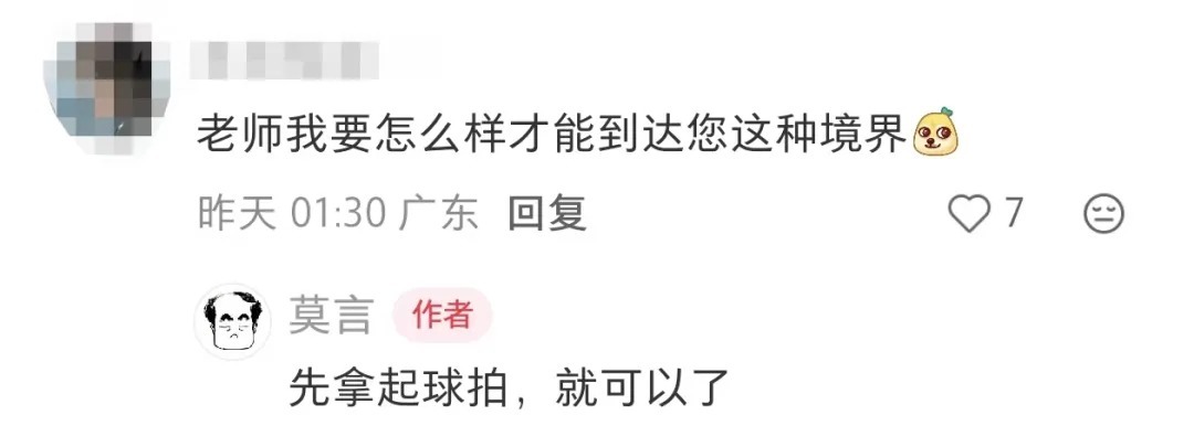 有网友问:“怎样才能达到您的这种境界?”莫言答:“先拿起球拍,就可以了。”