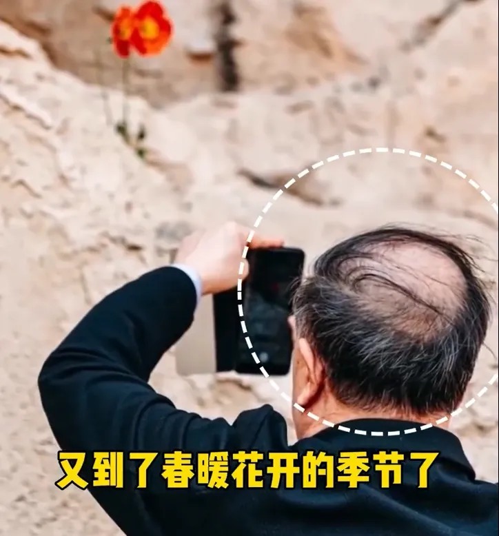 视频开头,是莫言顶着“地中海头”拍摄花朵的画面。