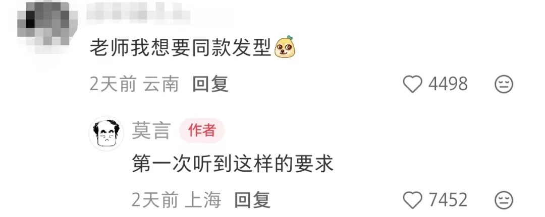 有网友调侃,“想要同款发型。”莫言幽默回怼:“第一次听到这样的要求。”