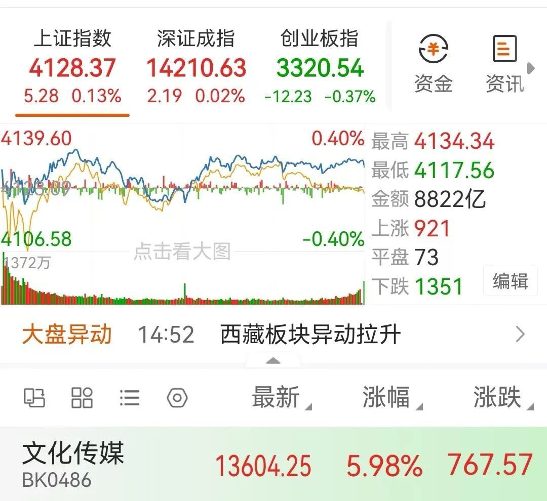 板块方面,文化传媒继续走强,两天累计涨逾11%。个股方面,捷成股份、中文在线、荣信文化连续两天涨停,影视巨头光线传媒当天亦收获20%的涨停板。